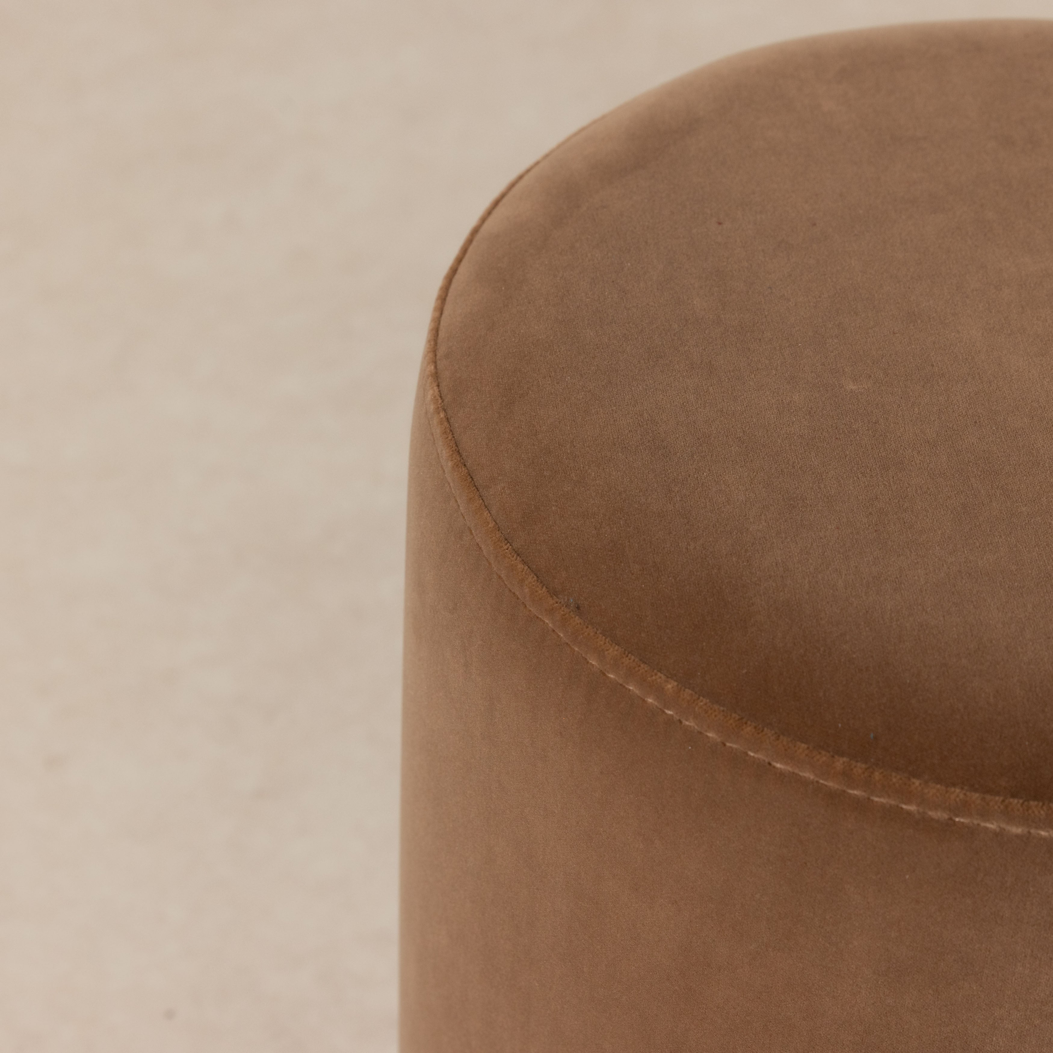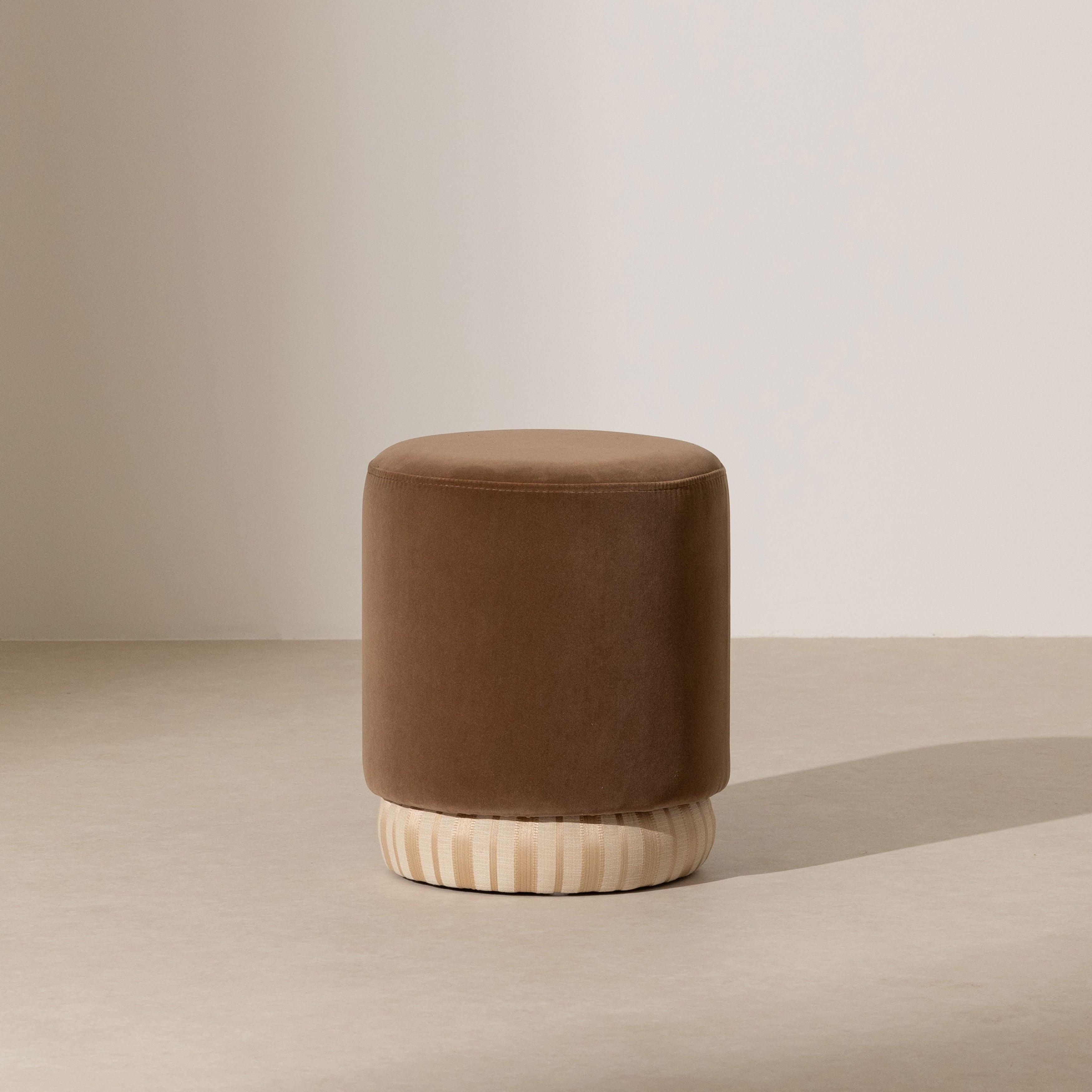 Rich in depth, colour and texture, this dual pouffes features sumptuous cotton velvet upholstery in a warm cocoa tone, complemented by a contrasting jacquard stripe plinth, that adds visual interest and refinement.