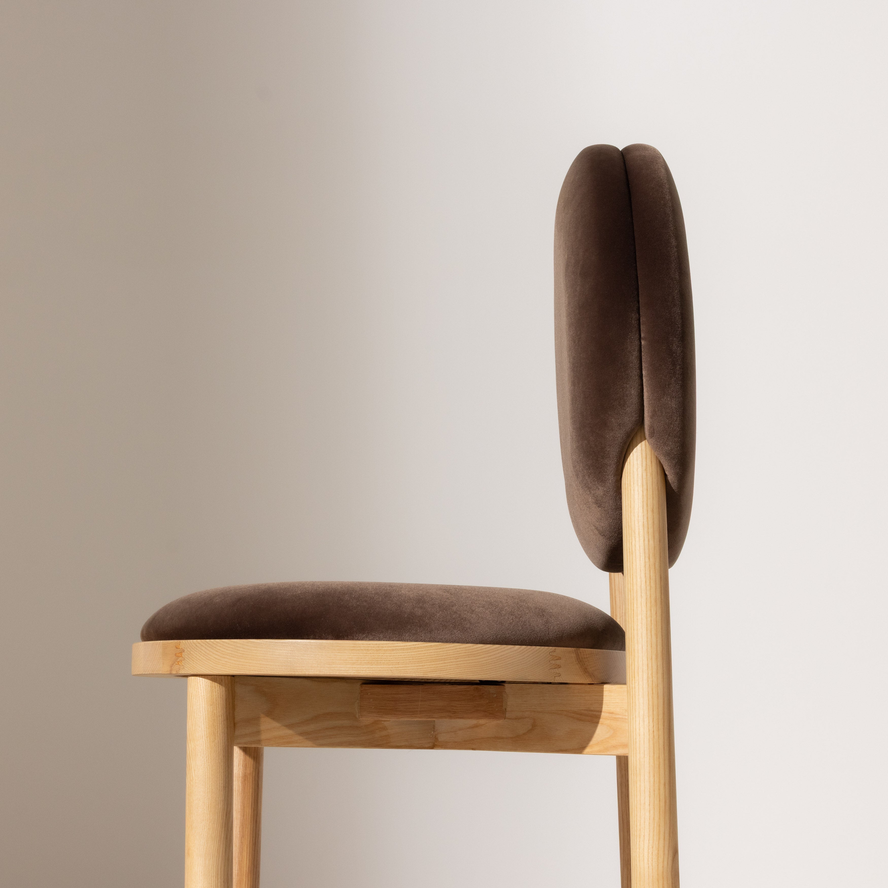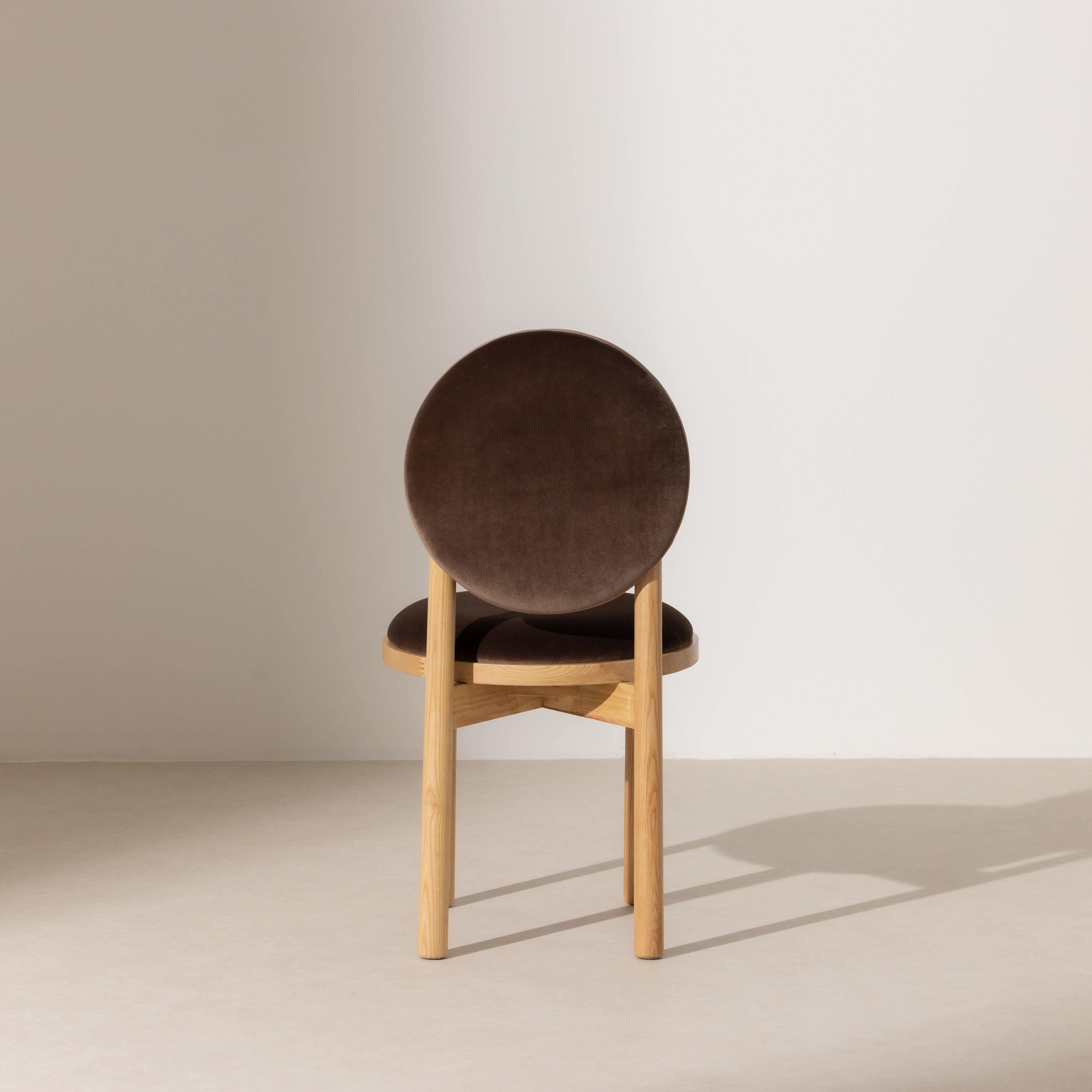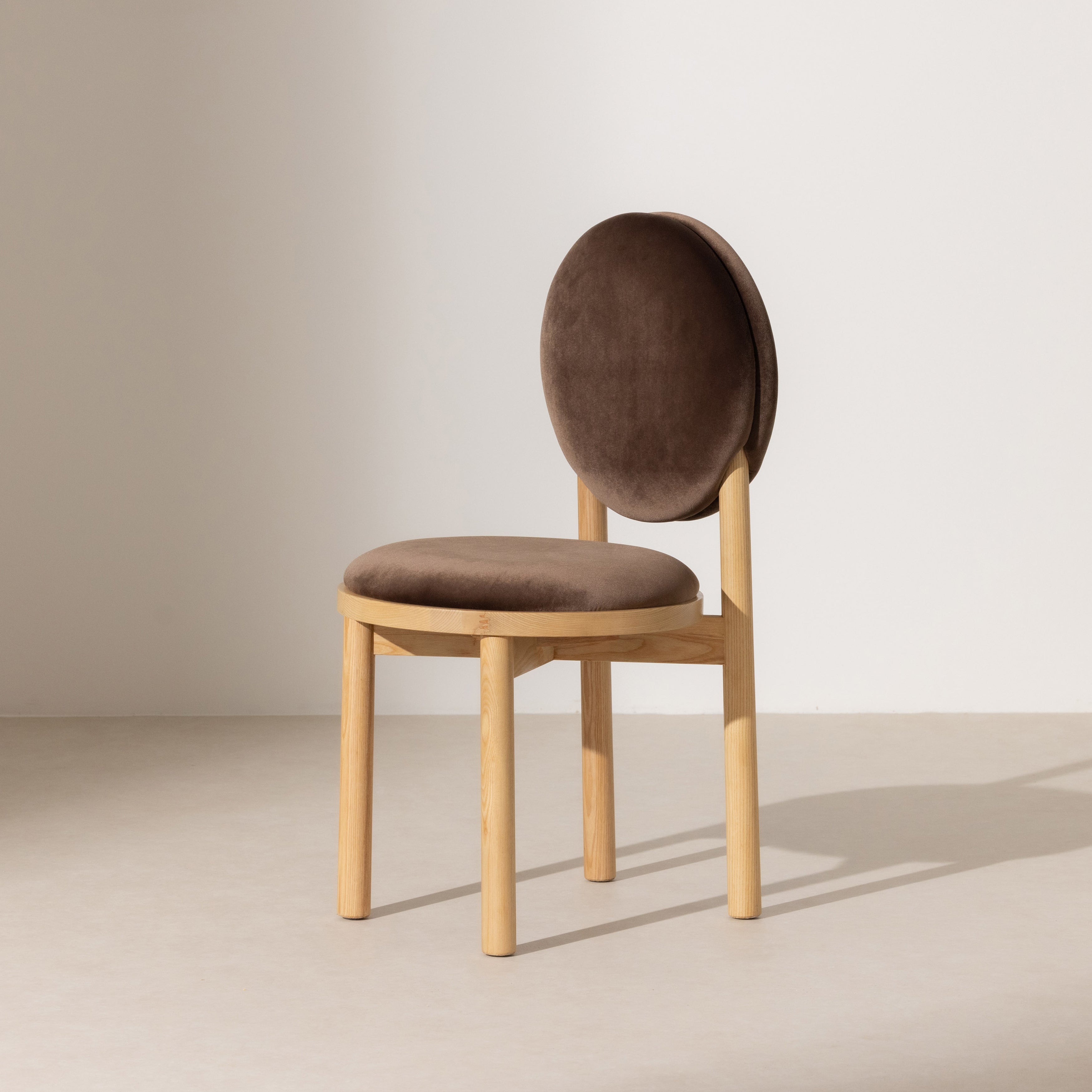 Its gracefully rounded seat and distinctive circular backrest create a sculptural profile that elevates any dining area. Supported by a sturdy solid ash-wood frame with a rich stained oak finish, this chair exemplifies quality craftsmanship. Upholstered in plush khaki coloured velvet, it provides an inviting texture and soft comfort, making it a timeless addition to sophisticated interiors.