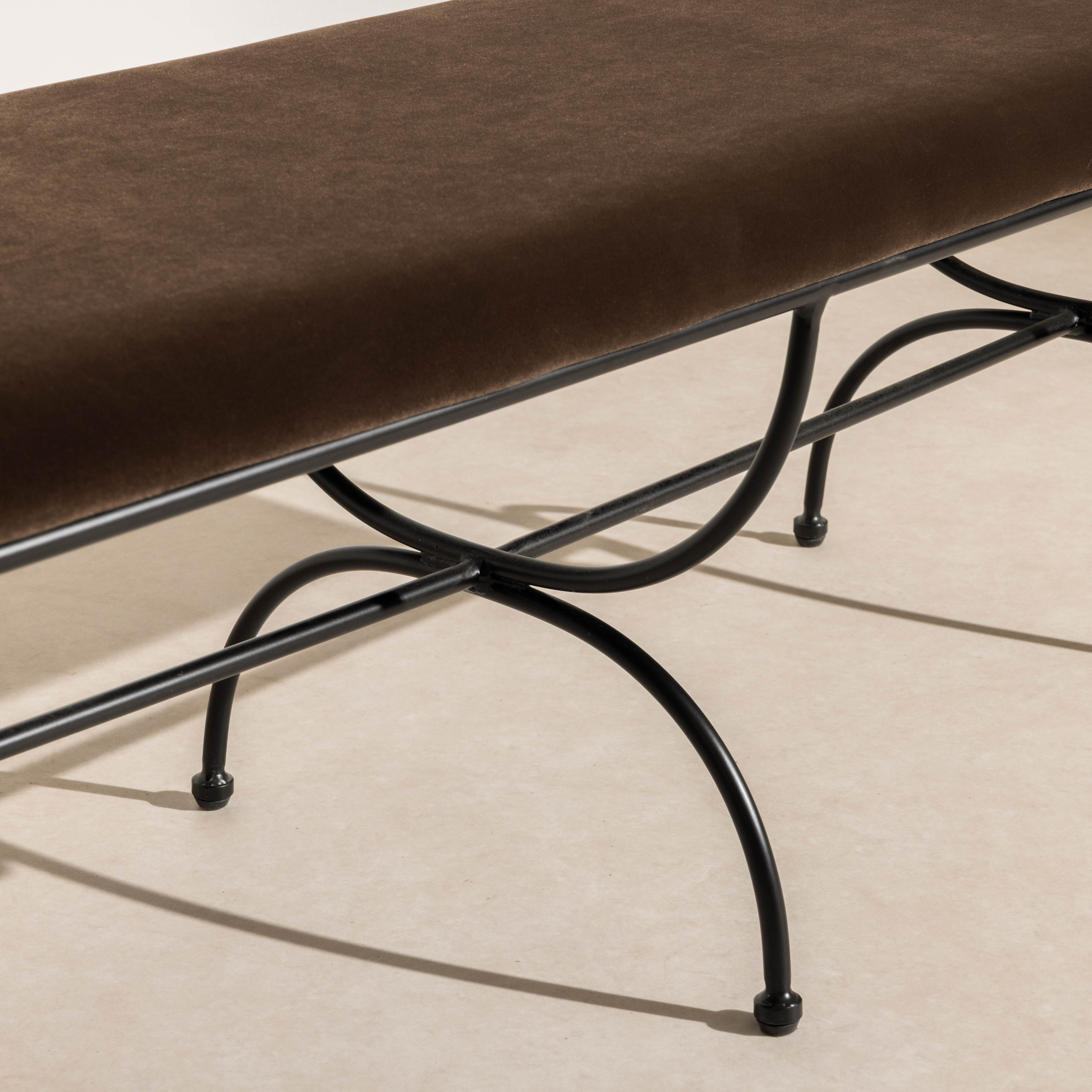 Create a stylish look with the Metal & Velvet Bench. Hand-made with a sturdy metal frame and plush upholstered seat, this bench offers both style and durability. A unique addition to any space, it's perfect for adding a touch of sophistication to your bedroom or hall-way.