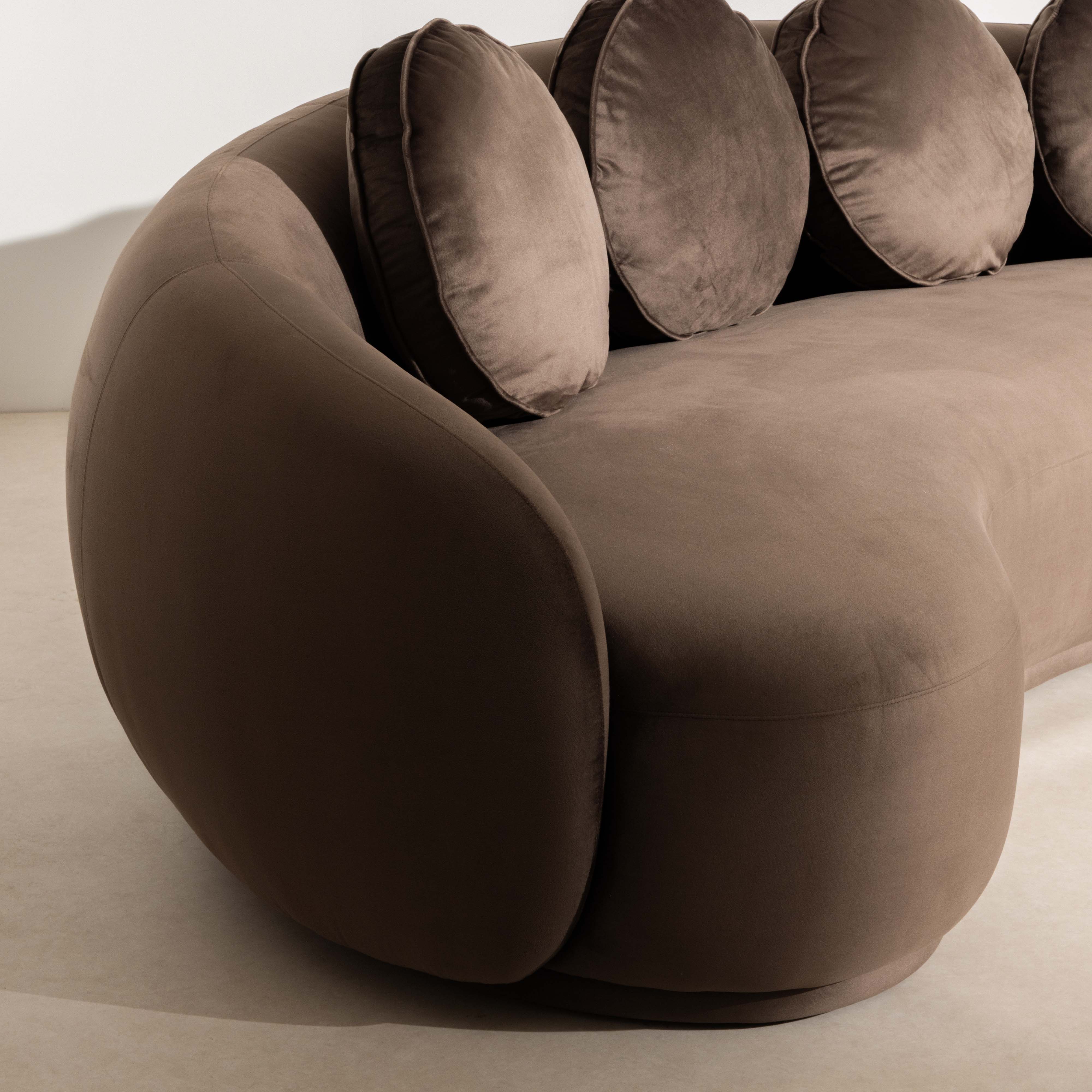 The rounded sides add warmth and sophistication, balancing modernity with a cosy feel. Fully upholstered in sumptuous house velvet in a rich chocolate hue, this sofa exudes understated luxury.